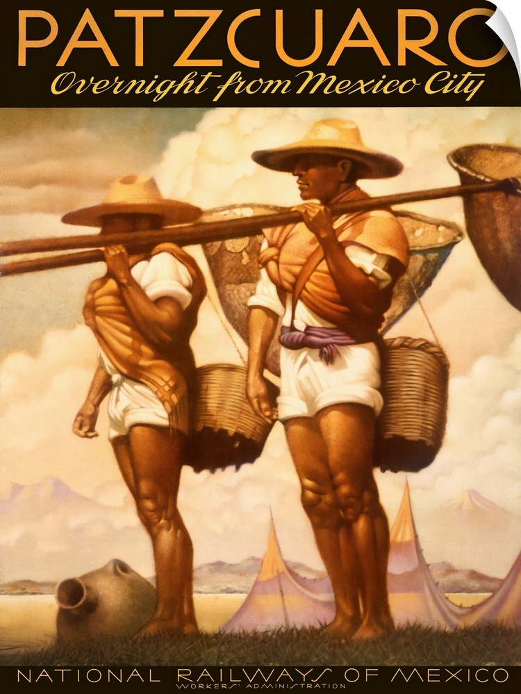 <p>Portrait advertisement on a big wall hanging for Patzcuaro, the National Railways of Mexico of two men in shorts and sun hats, carrying baskets over their shoulders and large baskets on wooden rods, standing in an open field, the mountains and large clouds in the background.</p>