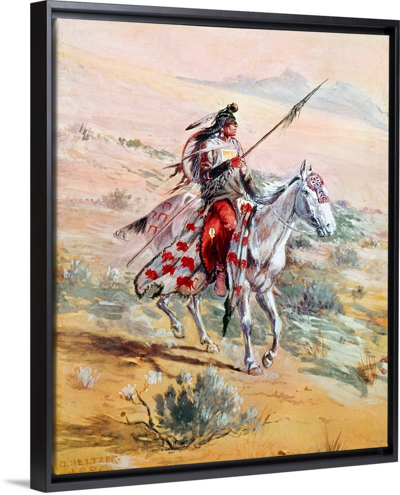 <p>Native American Warrior. A Native American Warrior On Horseback In A Western Landscape. Watercolor, 1906, By Olaf Carl Seltzer.</p>
