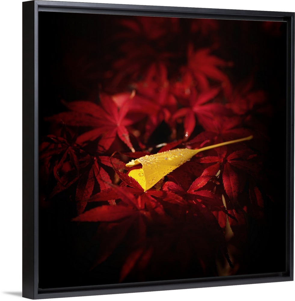 <p>Fine art photograph of a single yellow ginkgo leaf on a bed of red maple leaves.</p>