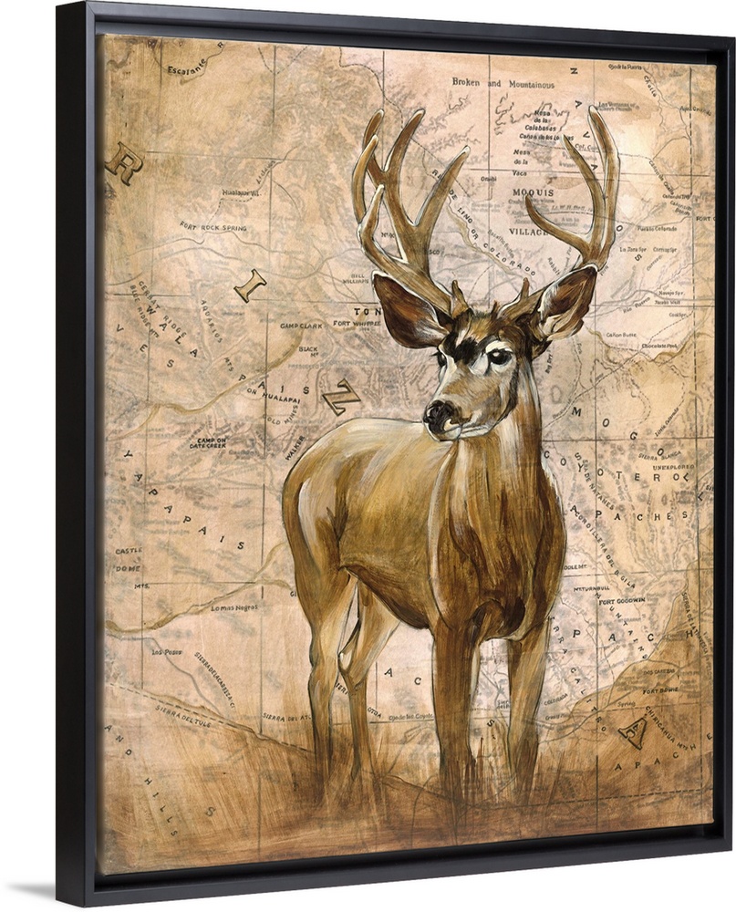 <p>Art piece of a big buck standing in front of a vintage looking map of Arizona.</p>
