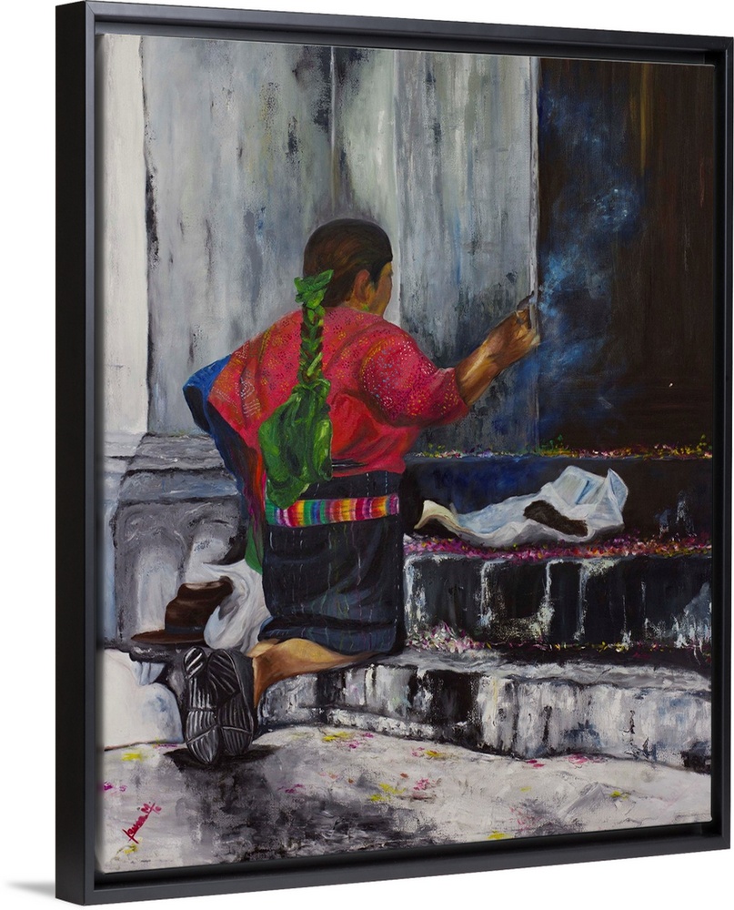 <p>A woman in traditional dress kneels on the stone steps of an ancient church in Mexico. Ribbons adorn her long, braided hair and embroidery covers her crimson blouse. A member of Callinart Artists, Laura Madrigal works in lucid oils to paint this intriguing portrait. Titled Indigena in Spanish.</p>