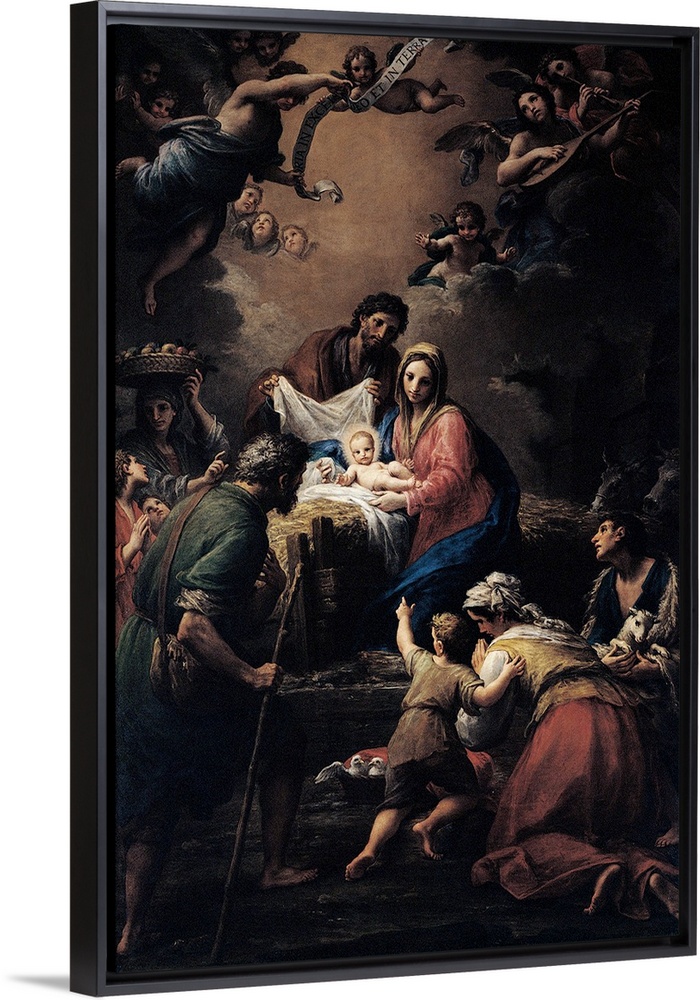 <p>Nativity, by Francesco Mancini, 18th Century, oil on canvas, - Italy, Lazio, Rome, Santa Maria Maggiore Basilica, apse. Full view. Nativity Baby Jesus halo Virgin Mary Madonna St Jospeh angels crown woman child shepherd lamb staff clouds red white blue ye</p>