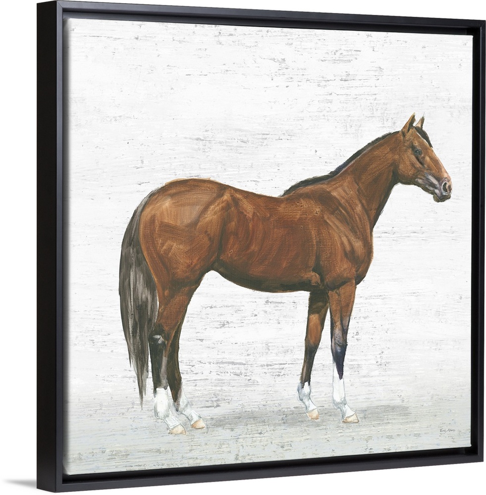 <p>Square painting of a dark brown horse on a textured white and gray background.</p>