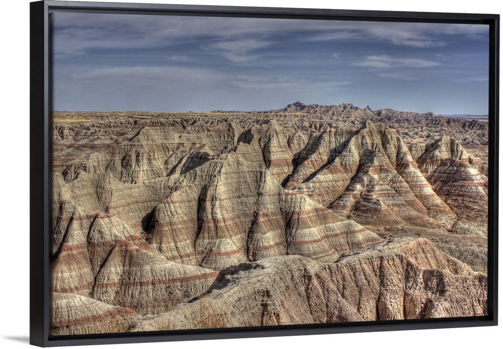 <p>Natural formations in Badlands of South Dakota, showing striations and contours.Hills show erosion and effects of time.</p>