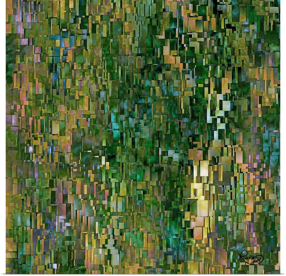 <p>Square abstract piece with tiny solid rectangles layered on each other to create a cracked look with mostly green and yellow hues.</p>