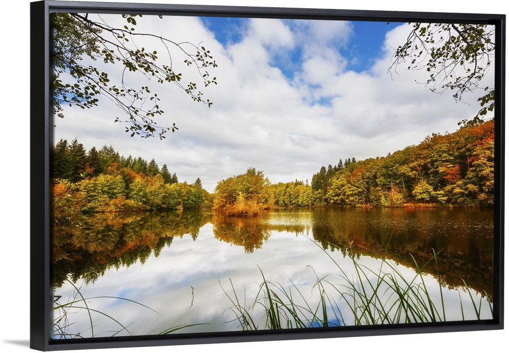 <p>Trees in a variety of fall colors mirrored in a lake with a cloudy sky above.</p>