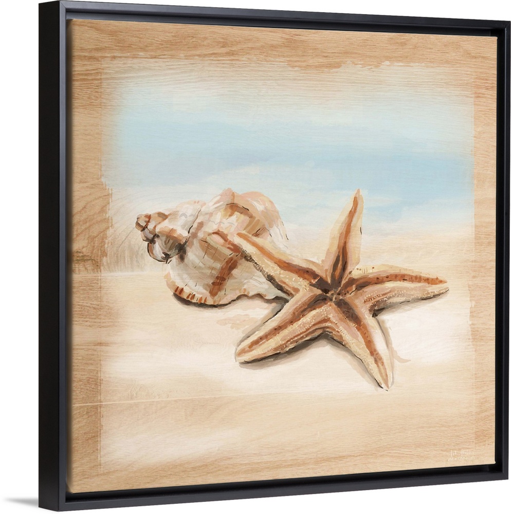 <p>Beach theme home decor artwork of a seashells against a sandy scene.</p>
