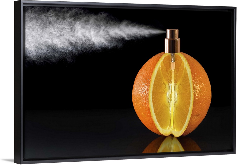 <p>Conceptual photograph of an orange with a wedge cut of it and a spray nozzle fitted to the top of it.</p>