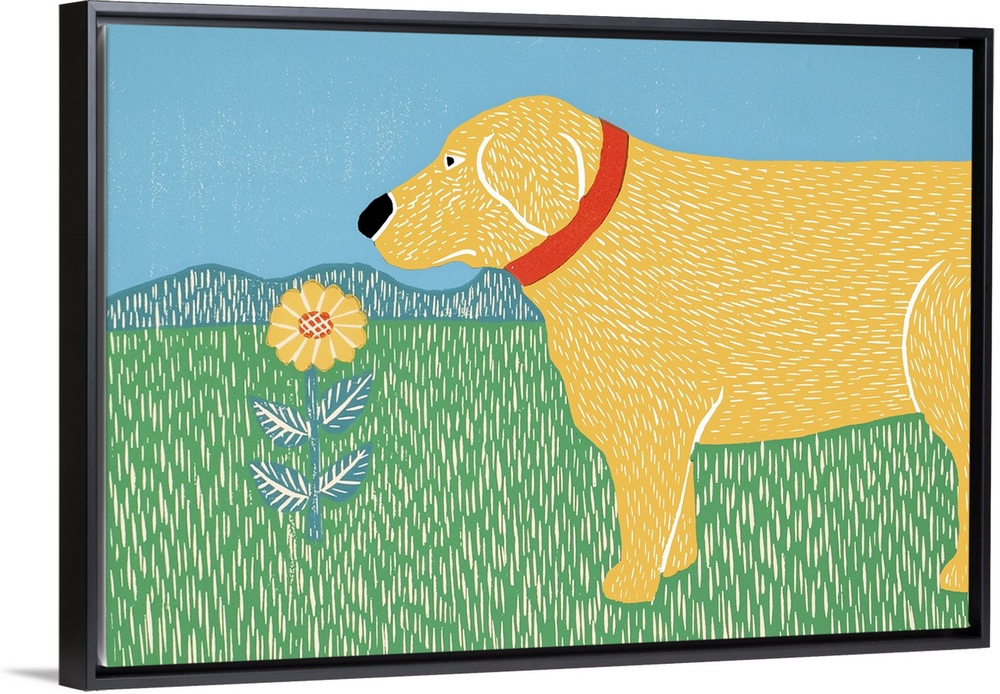 <p>Illustration of a yellow lab smelling a yellow flower.</p>