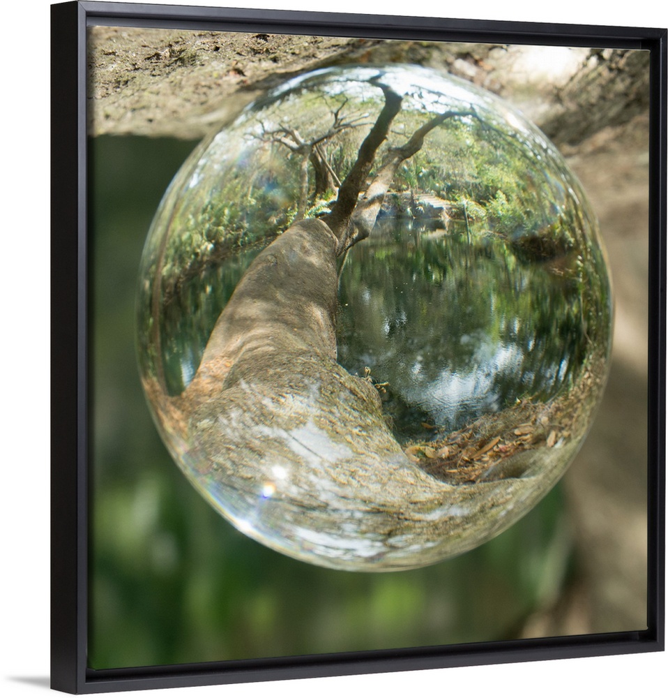 <p>This macro photograph of a watercolor droplet features a reflection of a branch over a pond.</p>