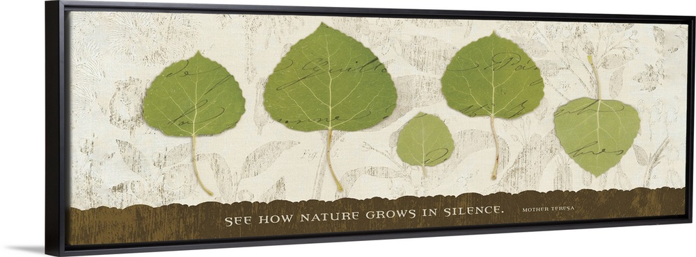 <p>This panoramic shaped collage features leaves over a lightly textured background with hand written text faintly appearing over them. The bottom of the canvas is a quote inspired by nature.</p>