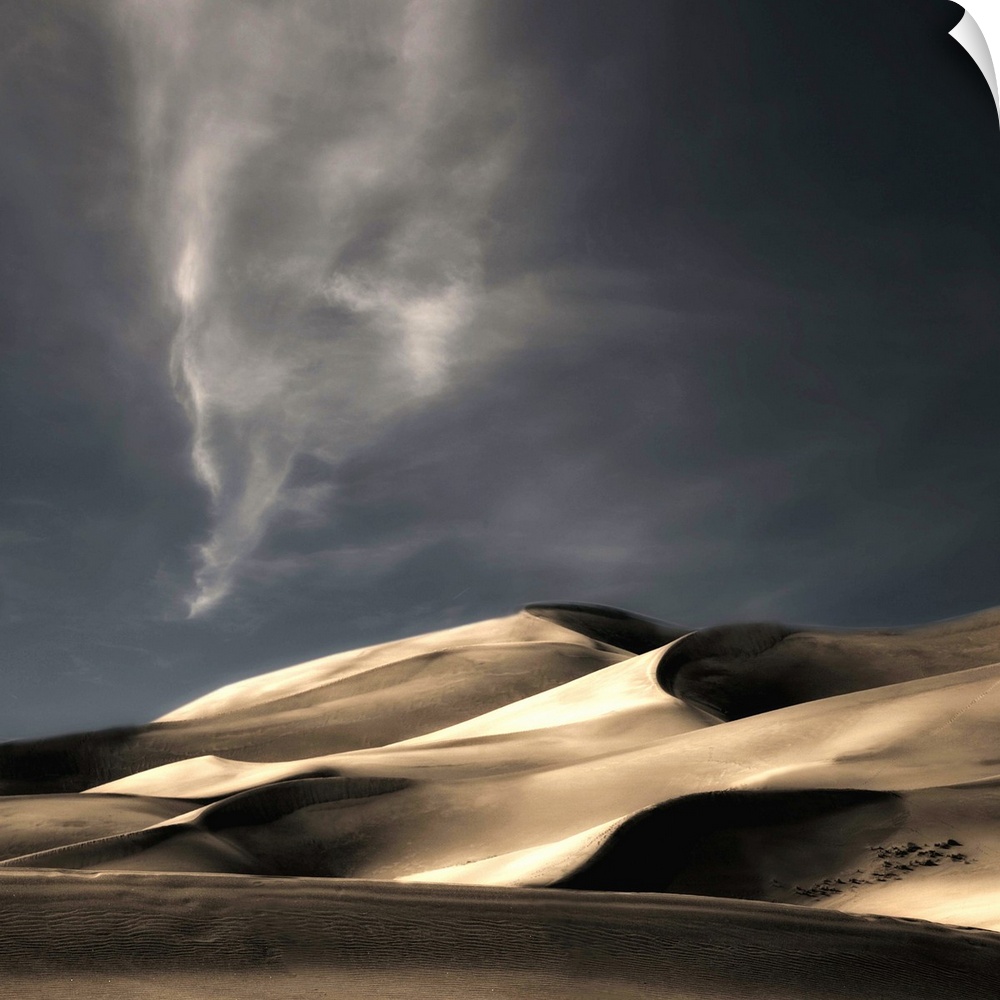 <p>Desert sand dunes casting deep shadows under a darkening sky, Colorado.</p>
