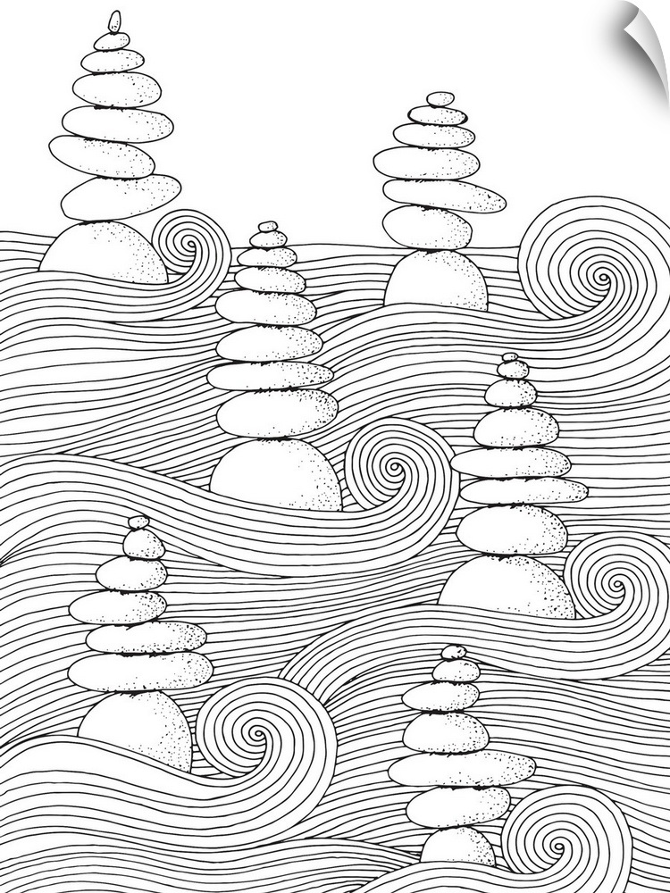 <p>Black and white line art of stacked rocks in moving, swirly waves.</p>