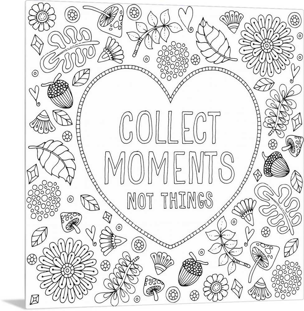 <p>Contemporary lined art with the phrase "Collect Moments Not Things" written inside a heart with a background made of flowers, leaves, acorns, and mushrooms.</p>