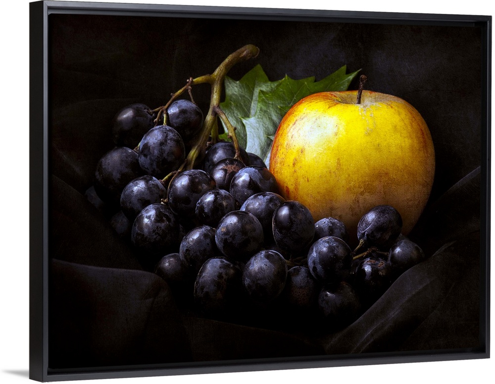 <p>Fine art still life photo of bunch of dark red grapes and a golden apple.</p>