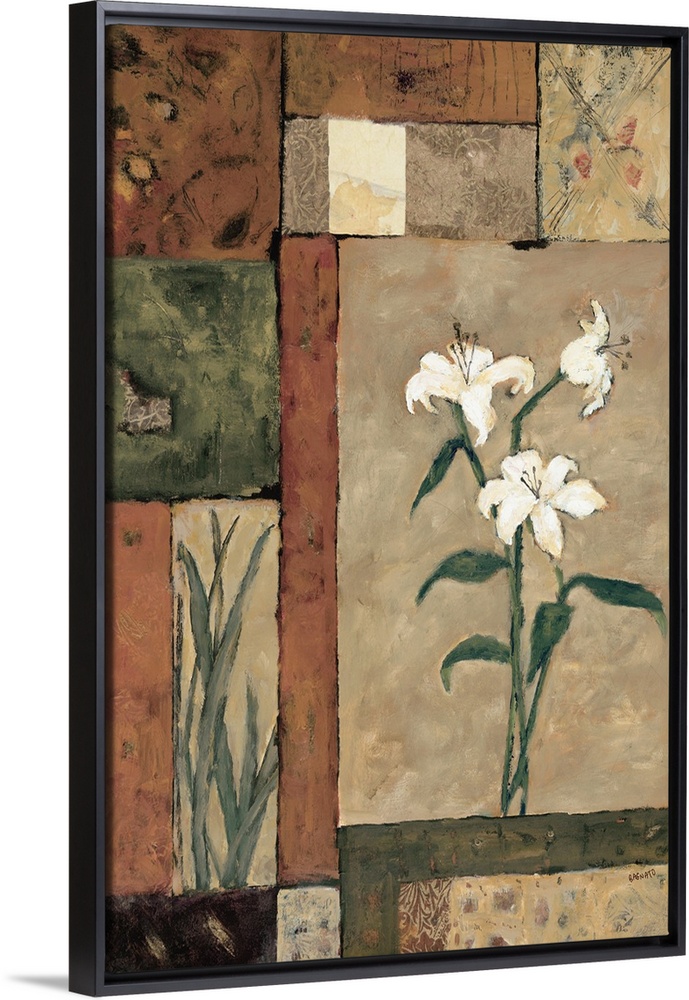 <p>Contemporary painting of white flowers with leaves over a geometric style background.</p>