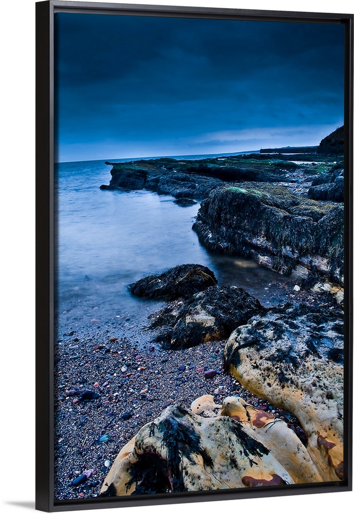 <p>A rocky beach at dusk with storm clouds overhead</p>