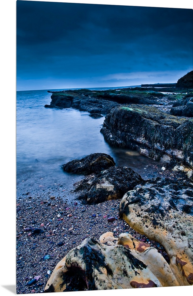<p>A rocky beach at dusk with storm clouds overhead</p>