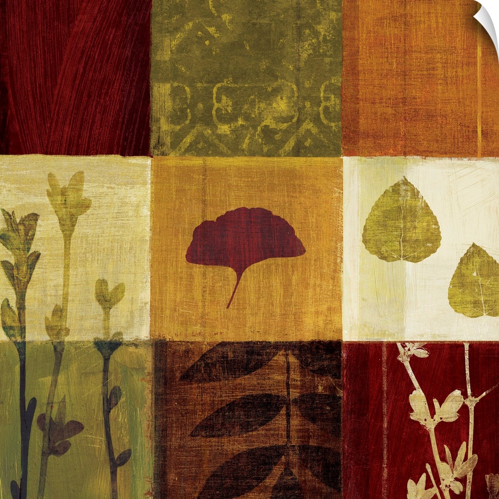 <p>Artwork of nine square tiles arranged in a 3x3 grid. Each square has a different type of leaf varying in color with an abstract background.</p>