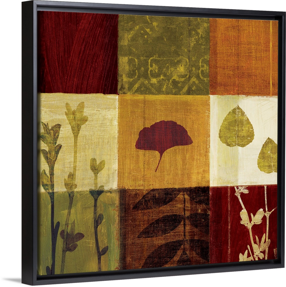 <p>Artwork of nine square tiles arranged in a 3x3 grid. Each square has a different type of leaf varying in color with an abstract background.</p>