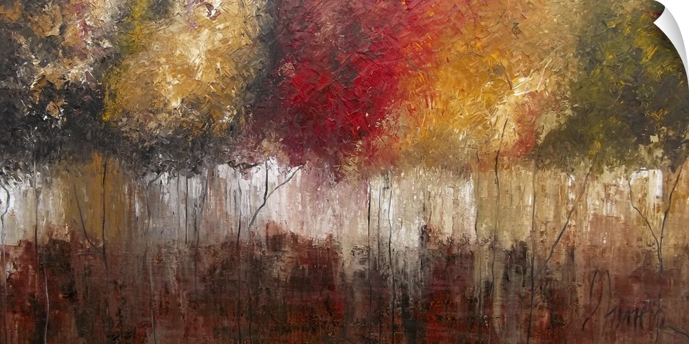 <p>Contemporary abstract painting using vibrant warm tones to create what resembles a line of trees in autumn foliage.</p>