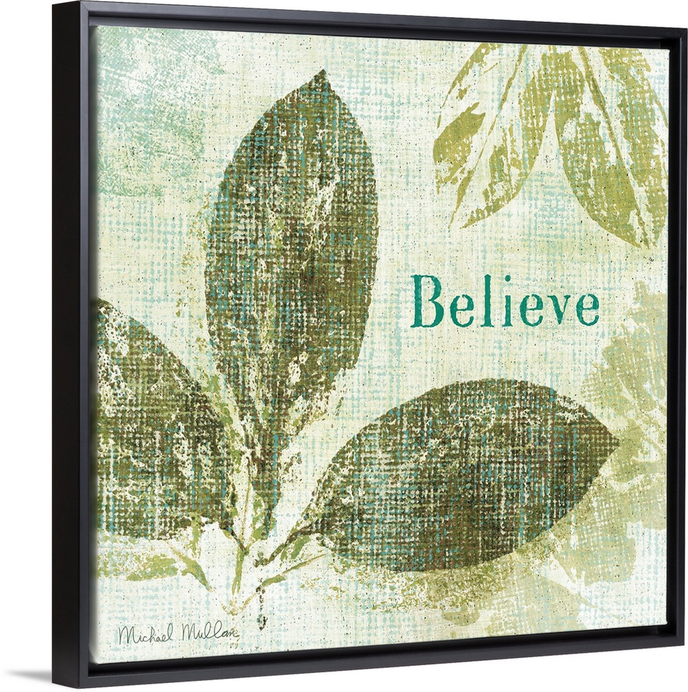 <p>Contemporary artwork of different types of leaves with the word "Believe" to the right of the image.</p>