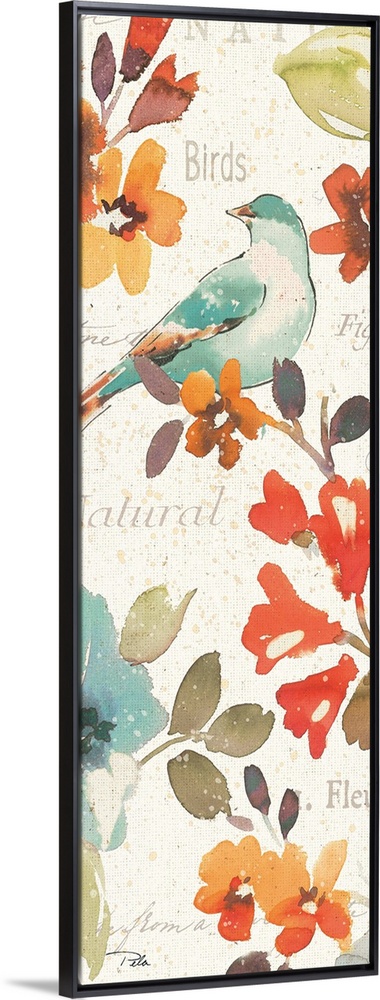 <p>Contemporary watercolor artwork of flowers and a bird, against a beige background with text.</p>