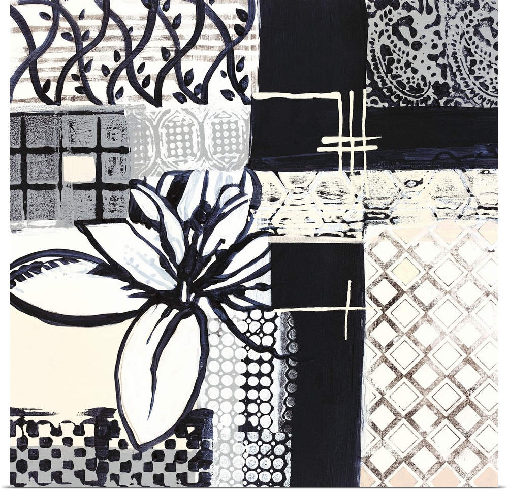<p>Black and white painting of squared shapes of varies patterns and a large flower on the left.</p>