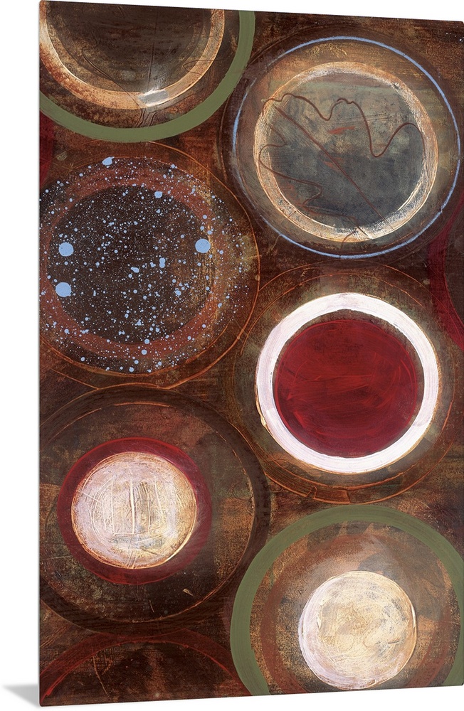 <p>Vertical modern painting of circles in multiple colors with speckles of blue paint overlapping.</p>