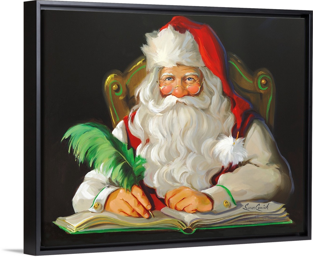 <p>Painting of Santa writing with a green feathered pen.</p>