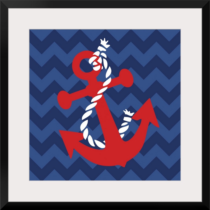 <p>Square nautical art with an illustration of a red anchor and white rope on a blue zig-zag patterned background.</p>
