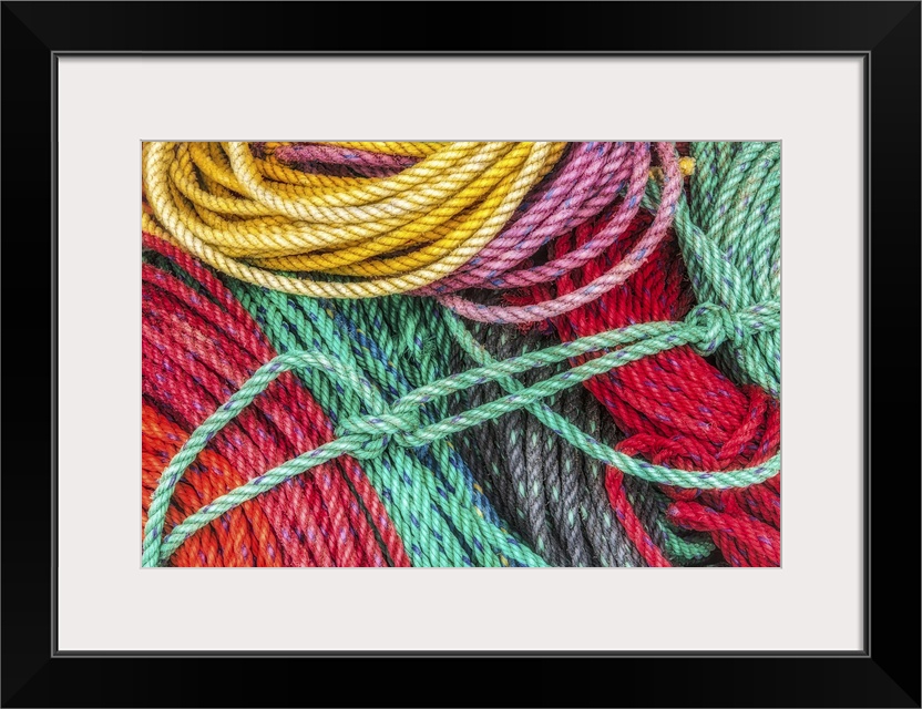 <p>Yellow, green, and red ropes laying in a pile at a dock in Acadia National Park, Maine.</p>