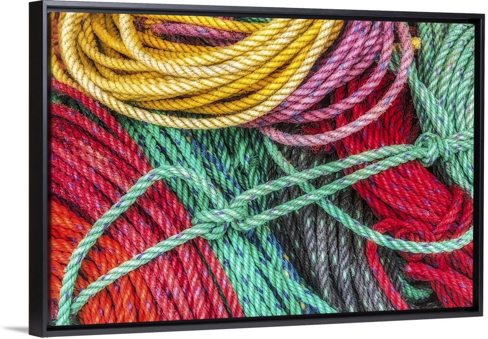 <p>Yellow, green, and red ropes laying in a pile at a dock in Acadia National Park, Maine.</p>
