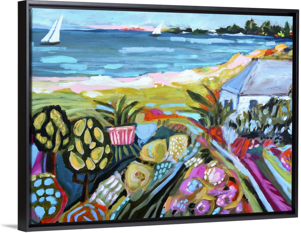 <p>Bohemian style illustration of a coastal landscape with flowering fields and sailboats on the water.</p>