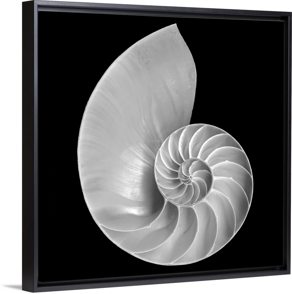 <p>Large monochromatic photograph centers on a marine mollusk against a blank background. The formation of the shell features a natural example of a logarithmic spiral as it curls into itself.</p>