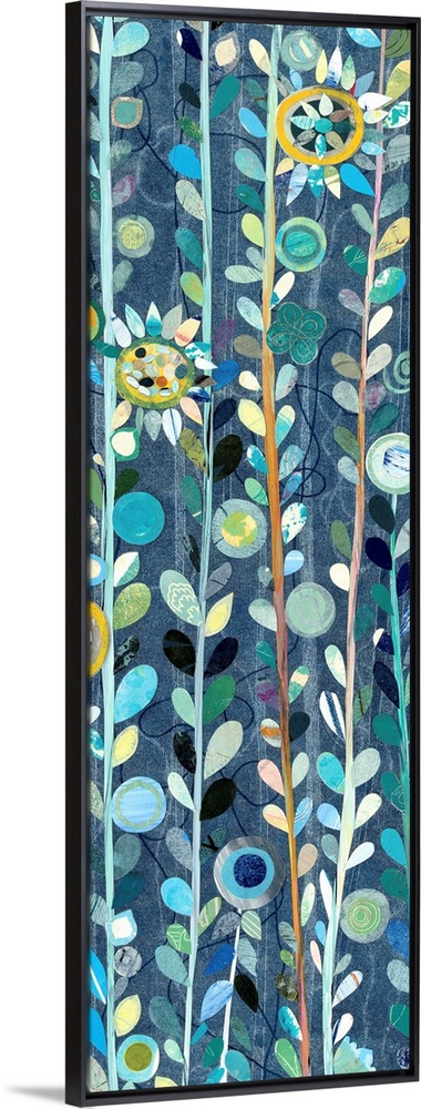 <p>Contemporary painting of long stems of leafy flowers against a navy blue background.</p>