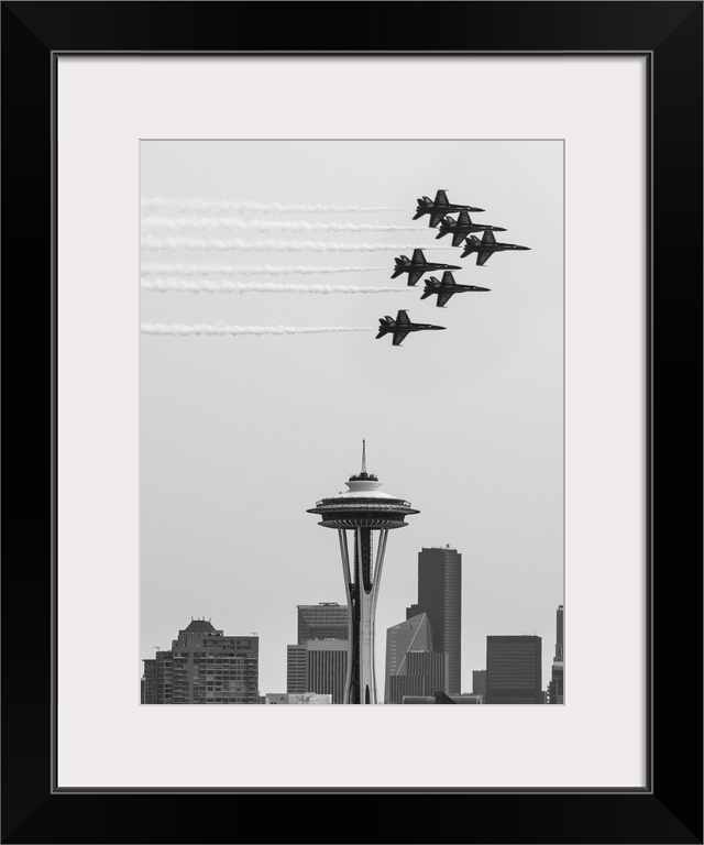 <p>Black and white photograph of Navy jets flying over the Seattle Space Needle.</p>