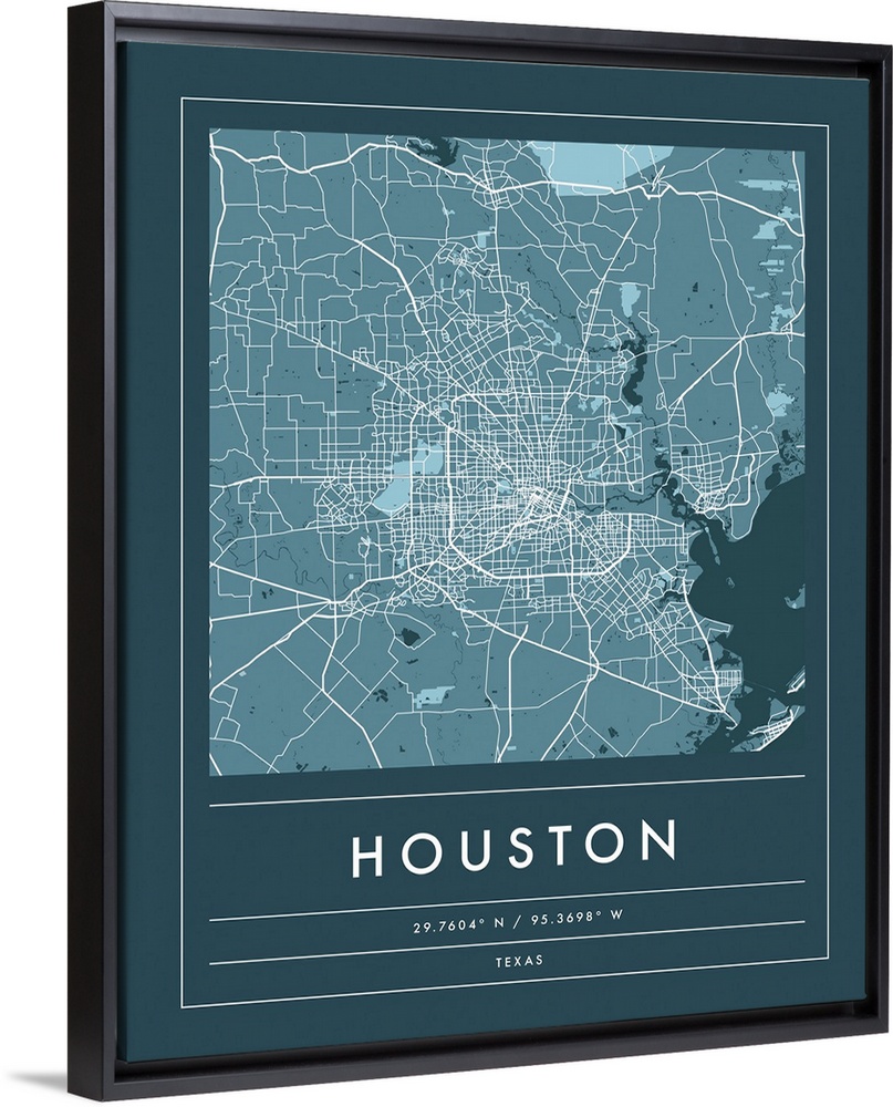 <p>Navy minimal city map of Houston, Texas, USA with longitude and latitude coordinates.</p>