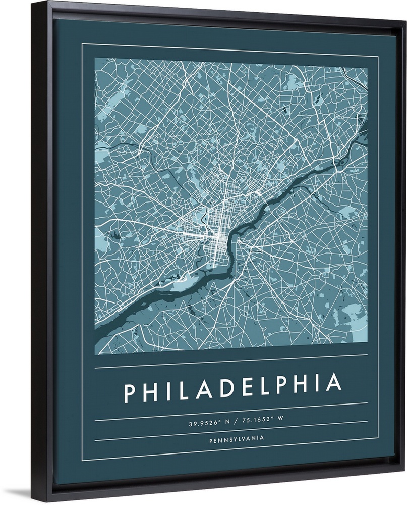 <p>Navy minimal city map of Philadelphia, Pennsylvania, USA with longitude and latitude coordinates.</p>
