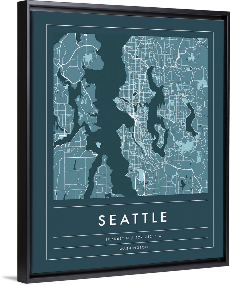 <p>Navy minimal city map of Seattle, Washington, USA with longitude and latitude coordinates.</p>