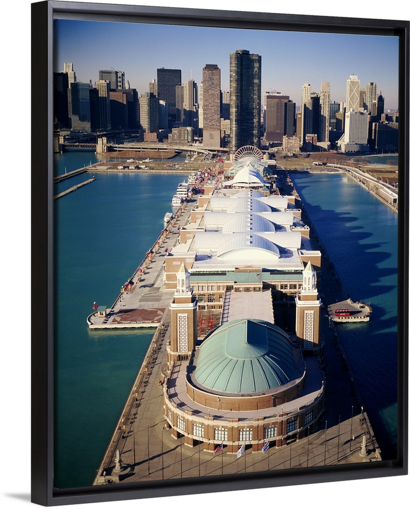 <p>A vertical photograph of a pier that juts out into Lake Michigan with a large pavilion built on top of it.</p>