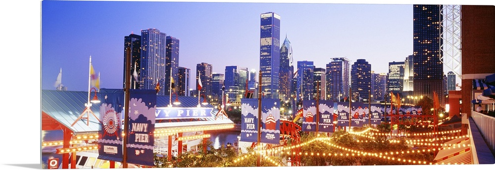 <p>Panoramic photograph of dock at night with city skyline in the background. The dock is strung with lights and the buildings in the distance are lit up.</p>