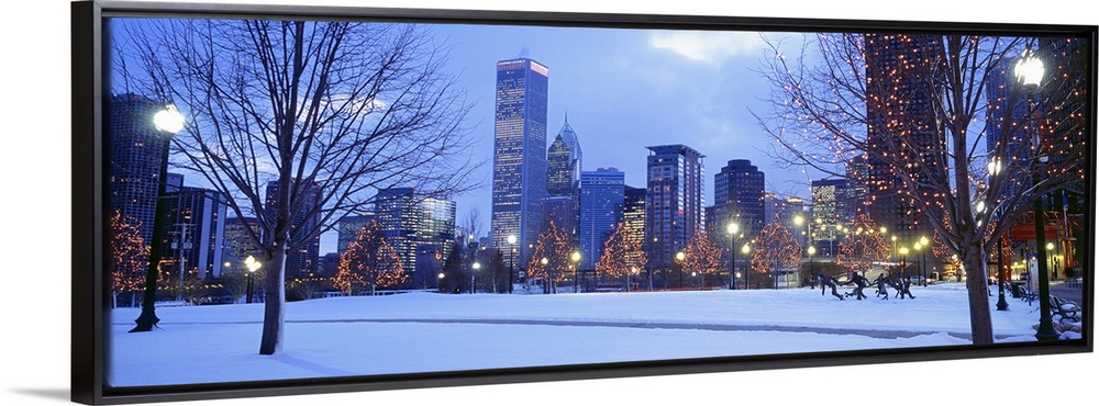 <p>Panoramic photograph of the Navy Pier Park at dusk lit up for the holidays in Chicago, Illinois.</p>