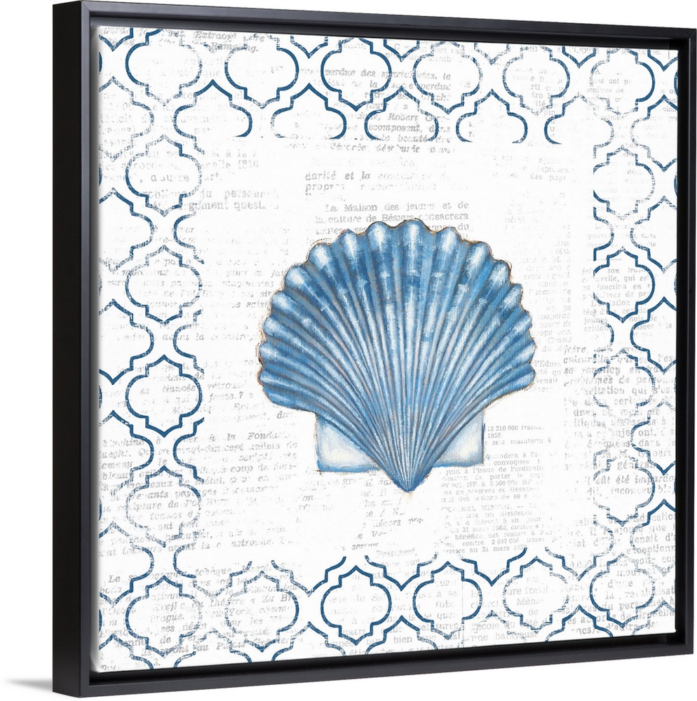 <p>Contemporary home decor artwork of a blue sea shell against a blue and white patterned background.</p>
