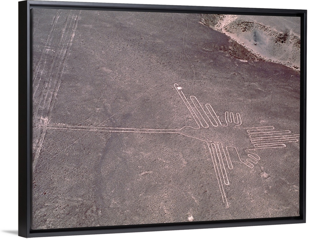 <p>Nazca lines. Aerial photograph of a geoglyph, or landscape drawing, in the coastal desert of southern Peru. This geoglyph (white lines, lower right) represents a hummingbird. Its beak extends to centre left. Many of the geoglyphs take the form of stylised animals and other objects. They cover huge areas and can only be properly seen from the air. They were made by removing the dark surface stone to reveal a lighter stone layer underneath. They are thought to have been made by the Nazca, a native South American people, around 2000 years ago. Theories about the lines have ranged from uses in astronomy (for seasonal agriculture) to ceremonial uses in religion.</p>