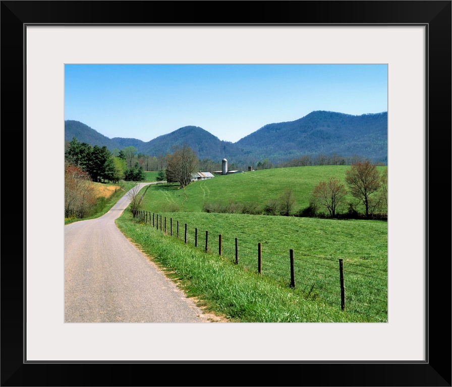<p>USA, North Carolina, Asheville. A winding road leads to an isolated farm in the hills near Asheville, North Carolina.</p>