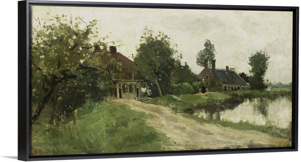 <p>Near Breukelen on the Vecht, by Nicolaas Bastert, c. 1870-23, Dutch painting, oil on panel. Farm houses on the Vecht River with peasant women carrying pails with a yoke on a road.</p>
