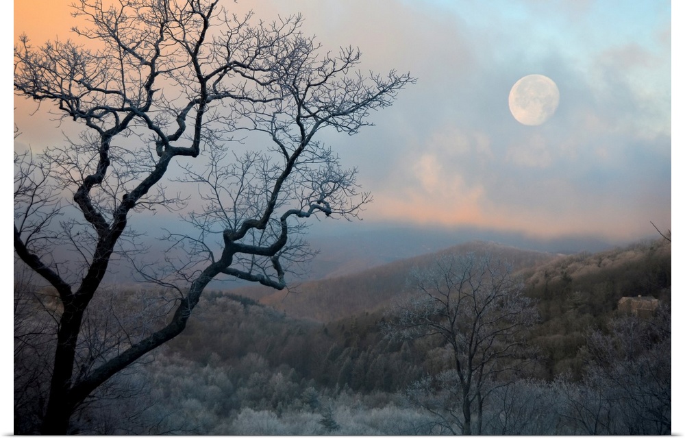 <p>Nearly full moon sets over the mountains at sunrise</p>