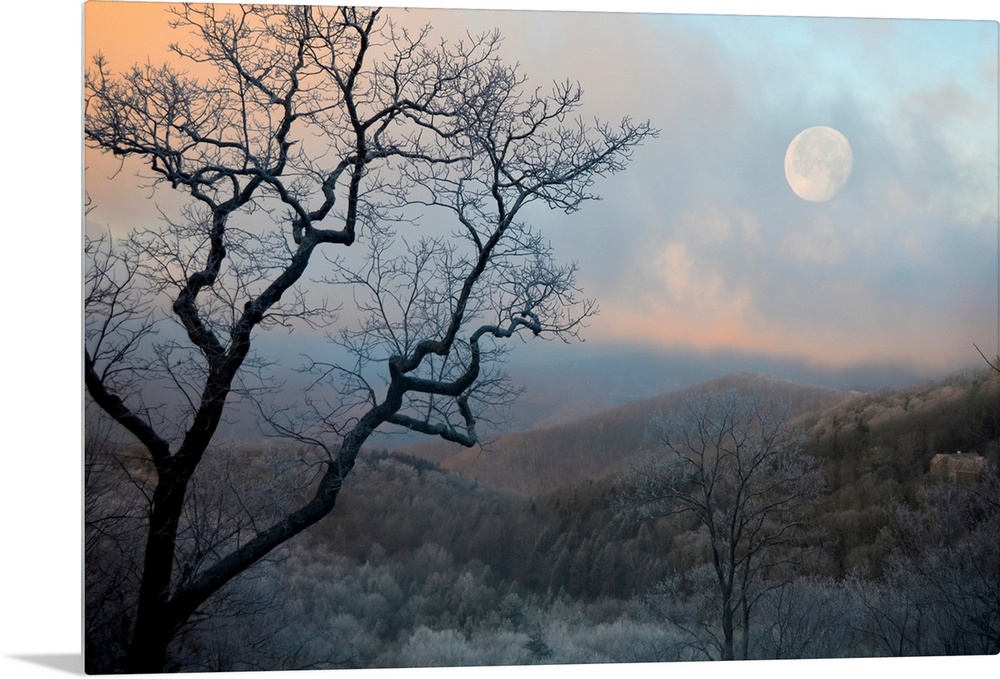 <p>Nearly full moon sets over the mountains at sunrise</p>
