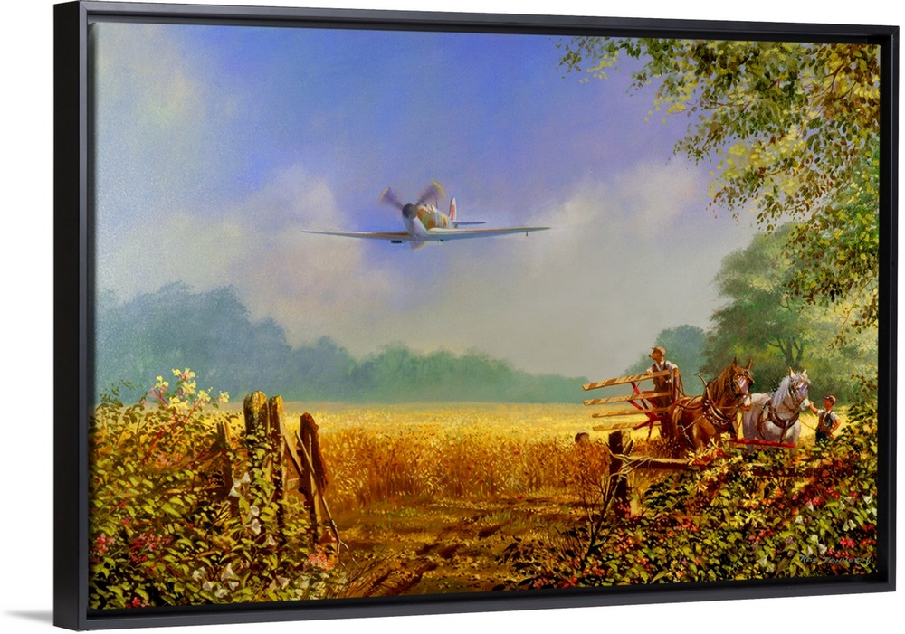 <p>Painting of a military plane flying over a rural farm landscape.</p>
